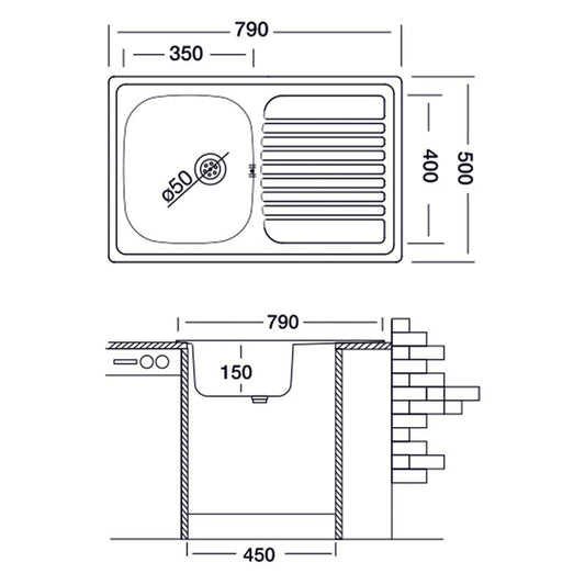 Eingebautes Küchenspülbecken aus Edelstahl mit Abtropffläche links, 50 x 79 cm