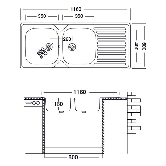 Lavello cucina due vasche acciaio da incasso gocciolatoio a dx 50x116 cm(N138DX35) EFFEZ