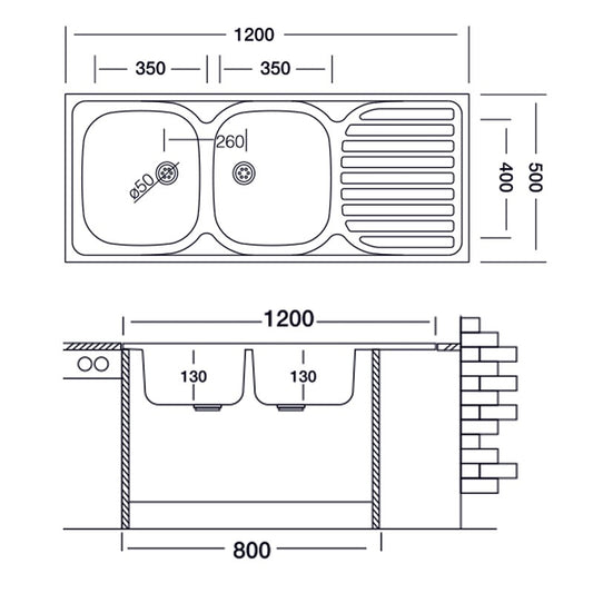 Küchenspüle mit zwei Becken und rechts angebrachter Abtropffläche aus Stahl, 50 x 120 cm