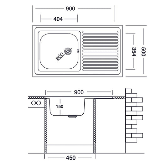 Eingebautes Küchenspülbecken aus Edelstahl mit Abtropffläche rechts, 50 x 79 cm