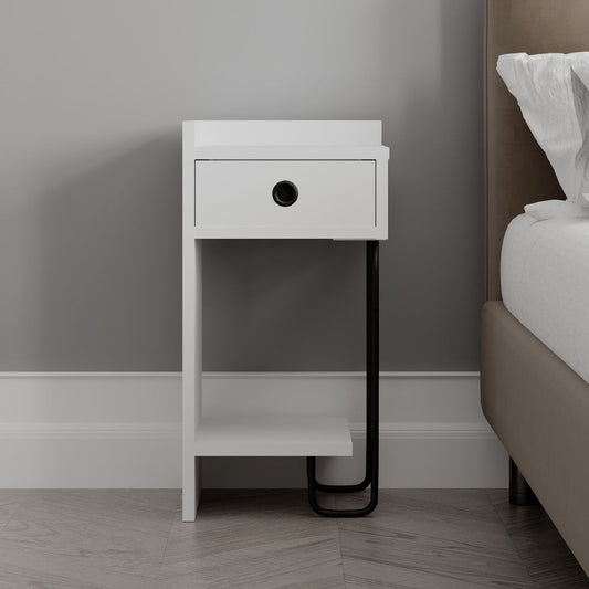 Weißer Nachttisch Sirius mit Schublade und linkem schwarzem Metallbein