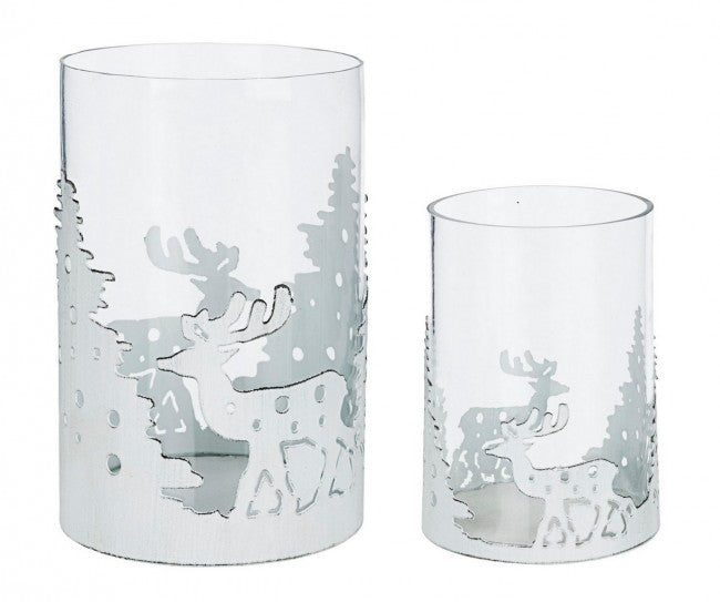 Diese Kerzengruppe eignet sich perfekt für eine einladende und romantische Atmosphäre in Ihrem Zuhause. Diese Kerzen bestehen aus hochwertigem Metall und Glas und verleihen Ihrem Raum einen Hauch von Eleganz und Stil. Ihr zylindrisches Design mit weißen Rentierdekorationen macht sie einzigartig und faszinierend.