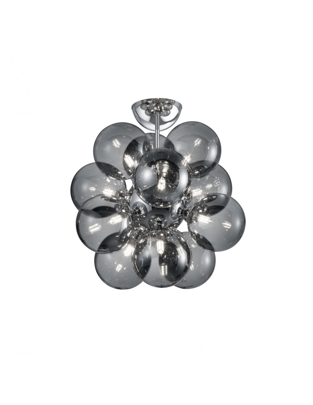 Die Deckenleuchte aus der ALICIA-Serie vonTrio-Beleuchtung Es besteht aus einer verchromten Metallstruktur und 12 geblasenen Rauchglas-Kugeldiffusoren, die wie eine Weintraube oder Seifenblasen gruppiert sind.