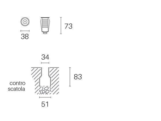 Boden eingelassen, begehbar. Struktur aus Aluminiumdruckguss. Edelstahlscheibe. Bruchsicherer Diffusor aus transparentem Glas. Max. 500 kg. Außenbox aus thermoplastischem Kunststoff. Beleuchtung mit 1 SMD-LED. Verbrauch: 2,5 W. Leistung: 25 W. Energieeinsparung: 83 %. Lichtstrom: 120 Lumen. Farbtemperatur: 3000°K. Heißes Licht. 24V DC-Stromversorgung. Netzteil nicht im Lieferumfang enthalten. Schutzklasse: IP67. Maximale Lampenleistung: 2,5 W