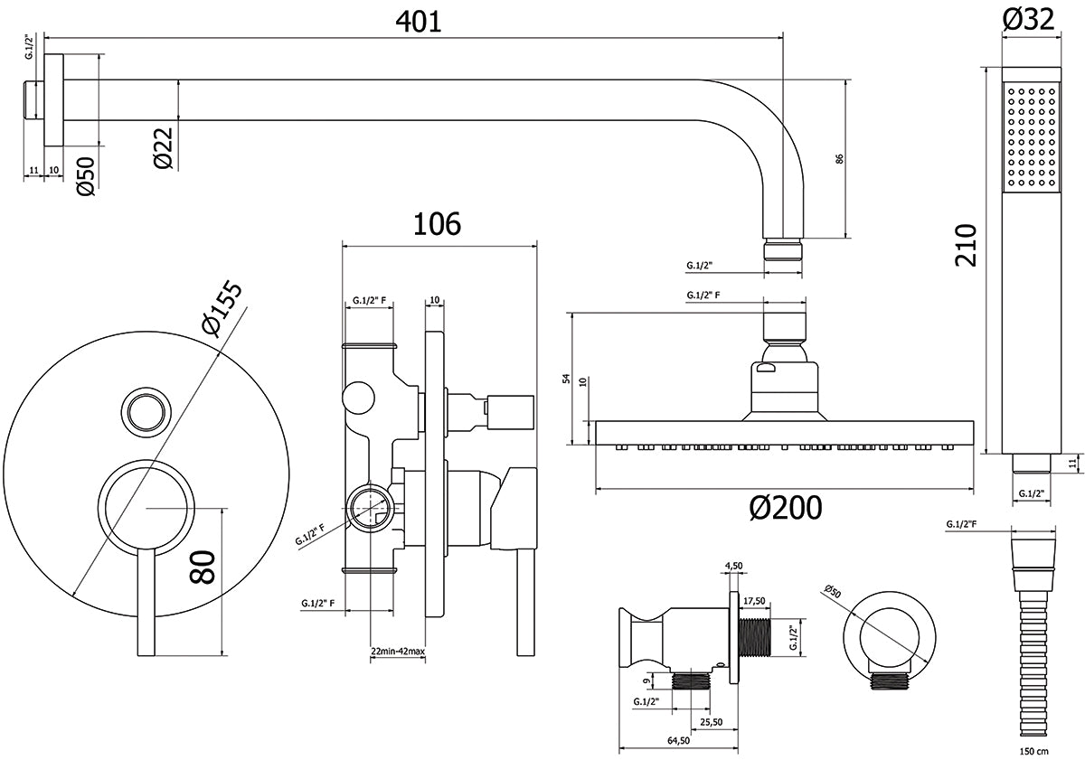 Einbau-Duschset komplett mit: Zweiwege-Einbau-Brausemischer. Duscharm aus Messing 40 cm. ABS-Duschkopf D.20 cm mit Anti-Kalk-Düsen. Wasseranschluss aus Messing mit Brausehalter. ABS-Einstrahlbrause mit Anti-Kalk-Düsen. Flexibles PVC 150 cm.