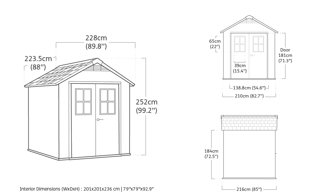 Casetta dal design classico con tradizionale finitura effetto legno, dotata di elevata resistenza e durabilità. La struttura realizzata con pannelli a doppia parete e con rinforzi in metallo resistente agli agenti atmosferici (eccetto gli eventi climatici più estremi). Il pavimento rialzato protegge il contenuto da fango e acqua, mentre il lucernario e le due finestre frontali forniscono alla casetta un'illuminazione naturale. Realizzata con innovativi pannelli in EVOTECH+™, particolare finitura che riproduce l'effetto del legno naturale, senza però le costanti manutenzioni di cui necessita il vero legno.