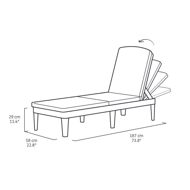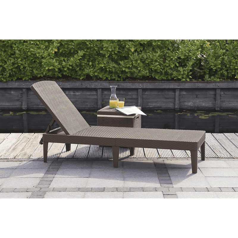 Er ist mit einer speziellen Verarbeitung gefertigt, die das typische Rattangeflecht nachahmt, und ist mit einer Rückenlehne ausgestattet, die sich in vier verschiedene Positionen neigen lässt.