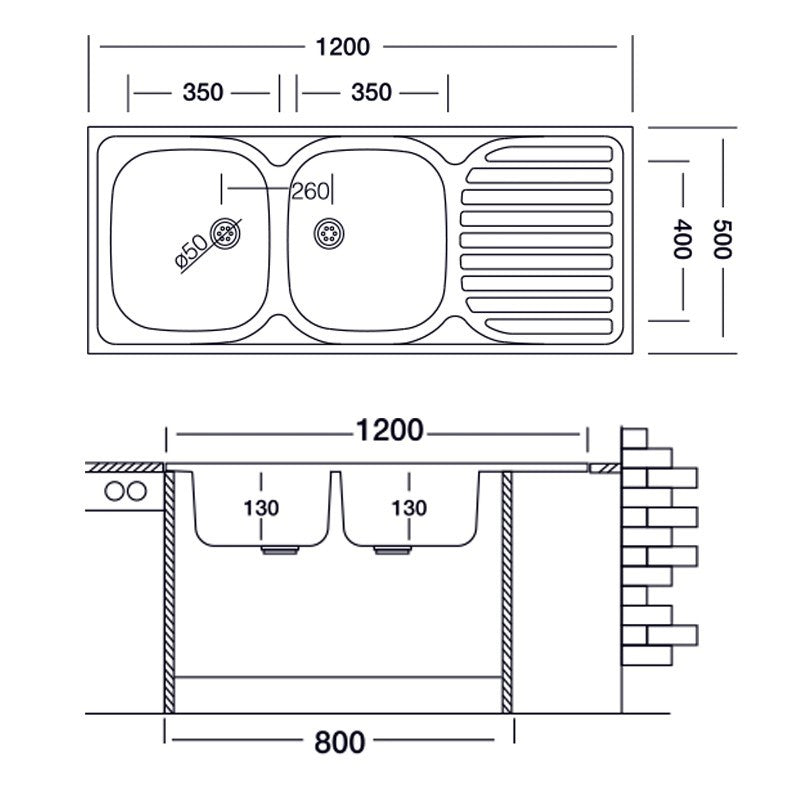 Küchenspüle mit zwei Becken und linker Abtropffläche aus Stahl, 50 x 120 cm