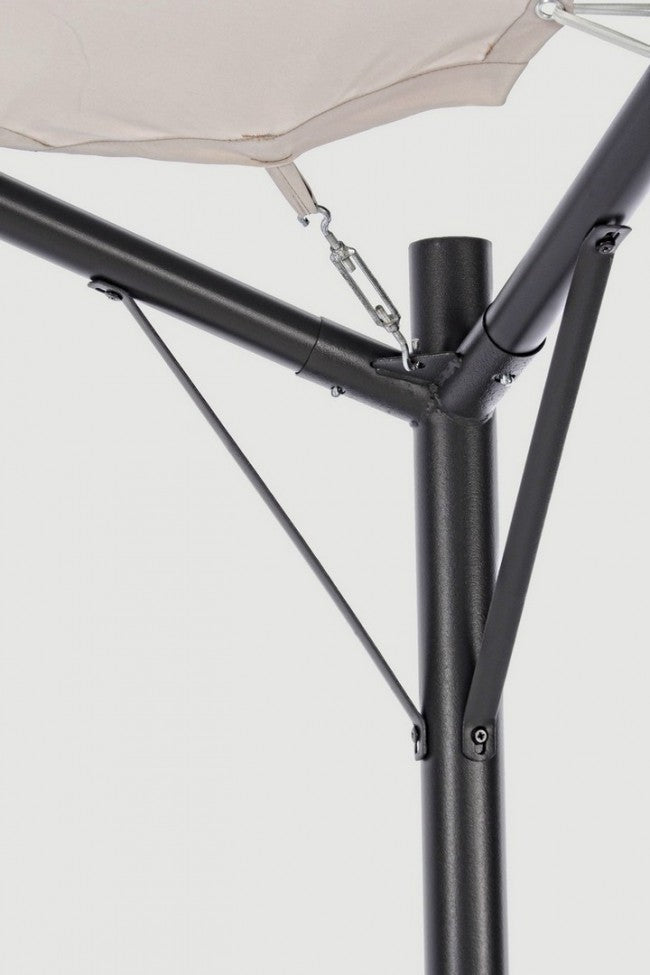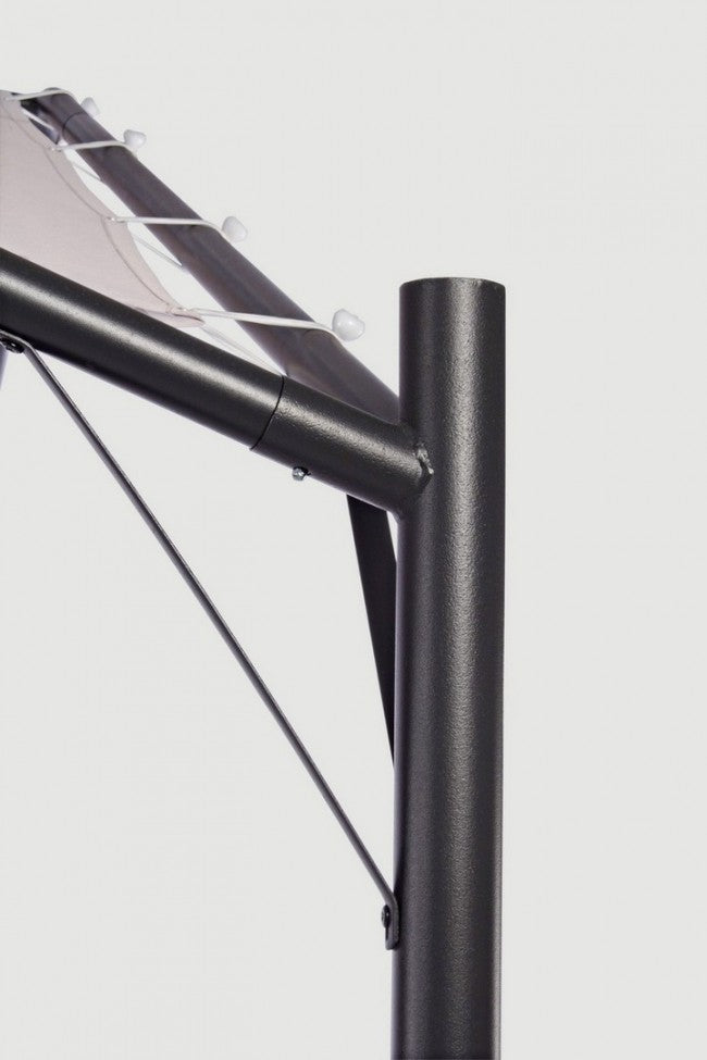 Die Struktur des Pavillons besteht aus Stangen mit einem Durchmesser von 58 mm, Querstreben und einem Dach mit einem Durchmesser von 42 mm. Diese robuste Konstruktion gewährleistet die Stabilität des Pavillons auch bei widrigsten Wetterbedingungen. Der Stahl ist behandelt, um äußeren Einflüssen wie Feuchtigkeit und Korrosion standzuhalten, während die Pulverbeschichtung zusätzlichen Schutz und ein elegantes Aussehen bietet.