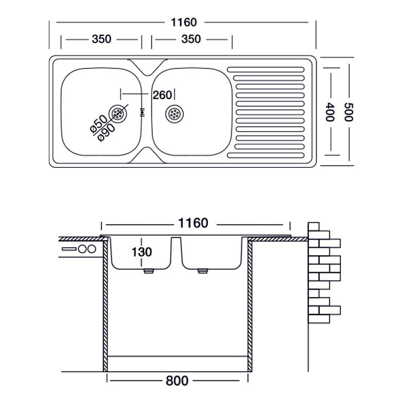 Lavello da incasso in acciaio Inox, della linea Classic, dotato di vasca doppia con gocciolatoio posizionato a destra. La superficie satinata dona un aspetto elegante e moderno al lavello. La piletta in scorta da 3 pollici e mezzo assicura un efficiente drenaggio dell'acqua. Lo scarico fognario ha un diametro di 50-90 mm. Lo spessore del lavello è di 0.50 mm, garantendo una resistenza e durabilità nel tempo. Il lavello è inoltre dotato di un foro per il rubinetto, offrendo la possibilità di installare un rubinetto a proprio piacimento. Le dimensioni del lavello sono di 50x116 cm, mentre la dimensione della vasca è di 350x400x130 mm. Questo lavello è ideale per armadi di dimensioni di almeno 80 cm.