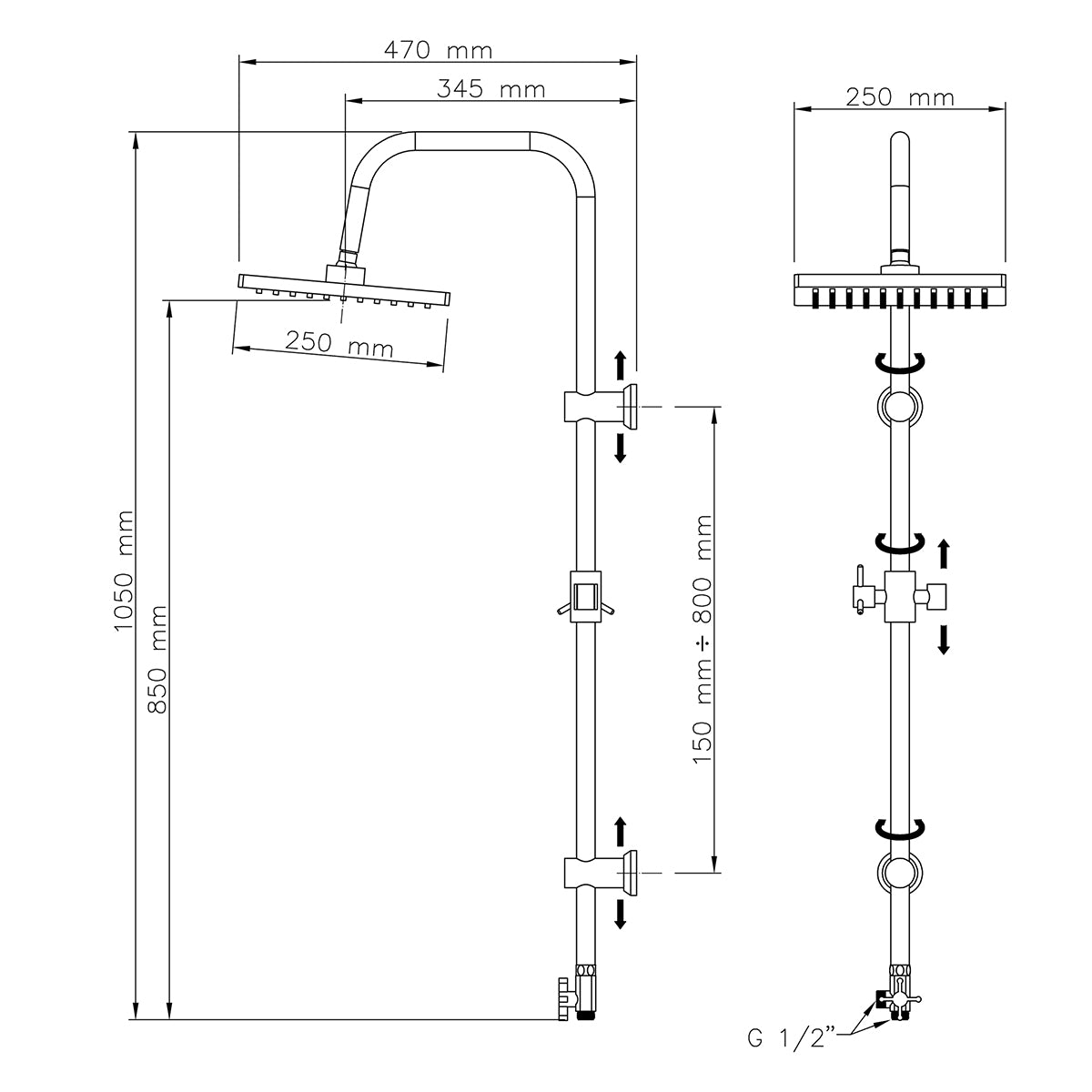 Anti-Kalk-Einstrahl-Handbrause; Anti-Kalk-Duschkopf, Durchmesser 25 cm, verstellbar; Doppelter ineinandergreifender Schlauch; Verstellbare verchromte Stahlstange 25–85 cm. (DianFlex)