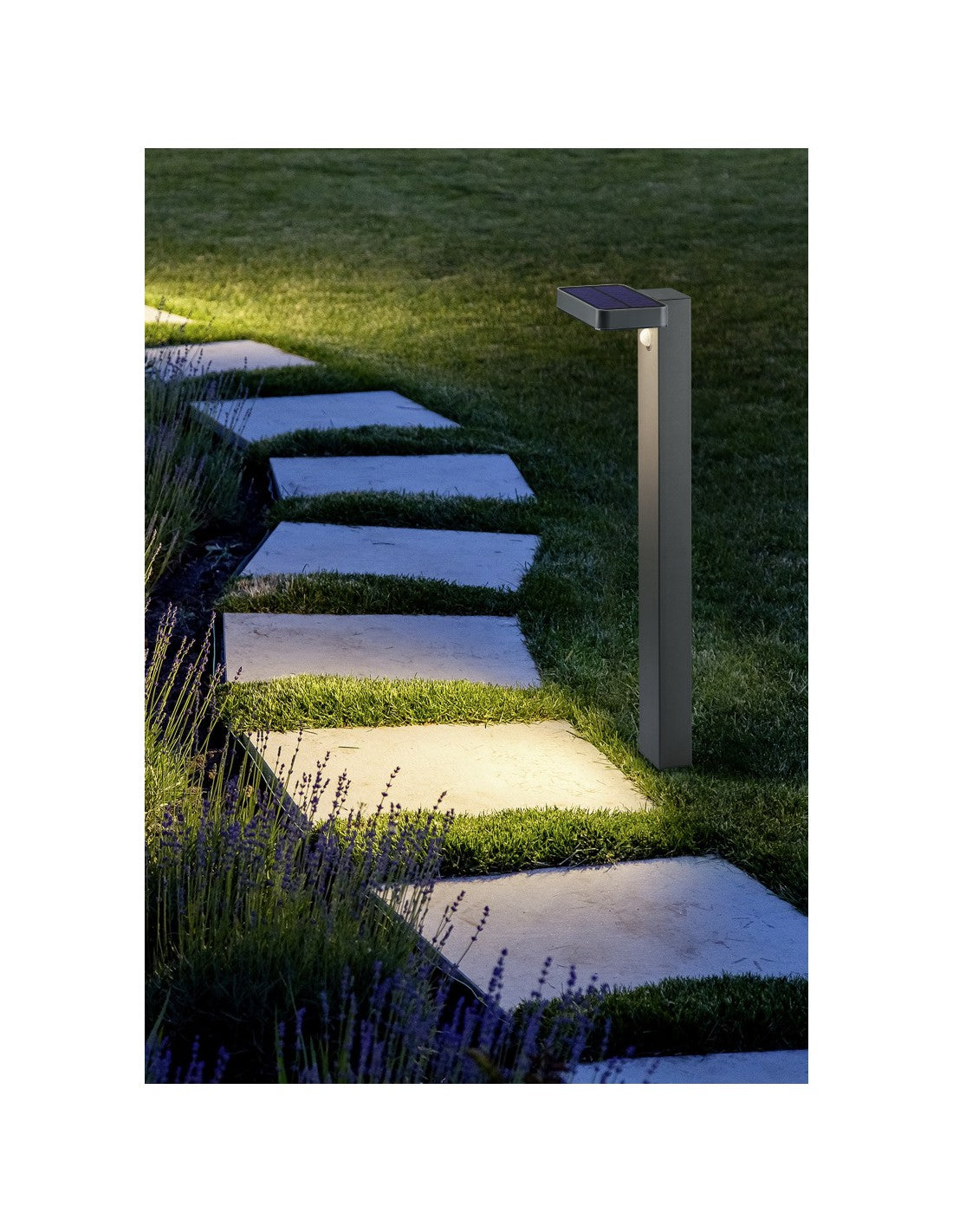 Der Outdoor-StabESQUEL von Trio Lighting Sie besteht aus einem anthrazitfarbenen Edelstahlgehäuse mit einem rechteckigen Diffusor.