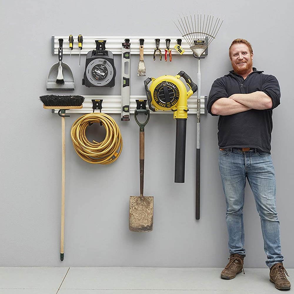 Werkzeug-Organizer zur ordentlichen Aufbewahrung all Ihrer Werkzeuge, Elektrowerkzeuge, Gartenzubehörteile und allem anderen in Ihrer Garage. Vollständig anpassbares und integrierbares System, da zahlreiche Zubehörteile und andere Schienen hinzugefügt werden können.