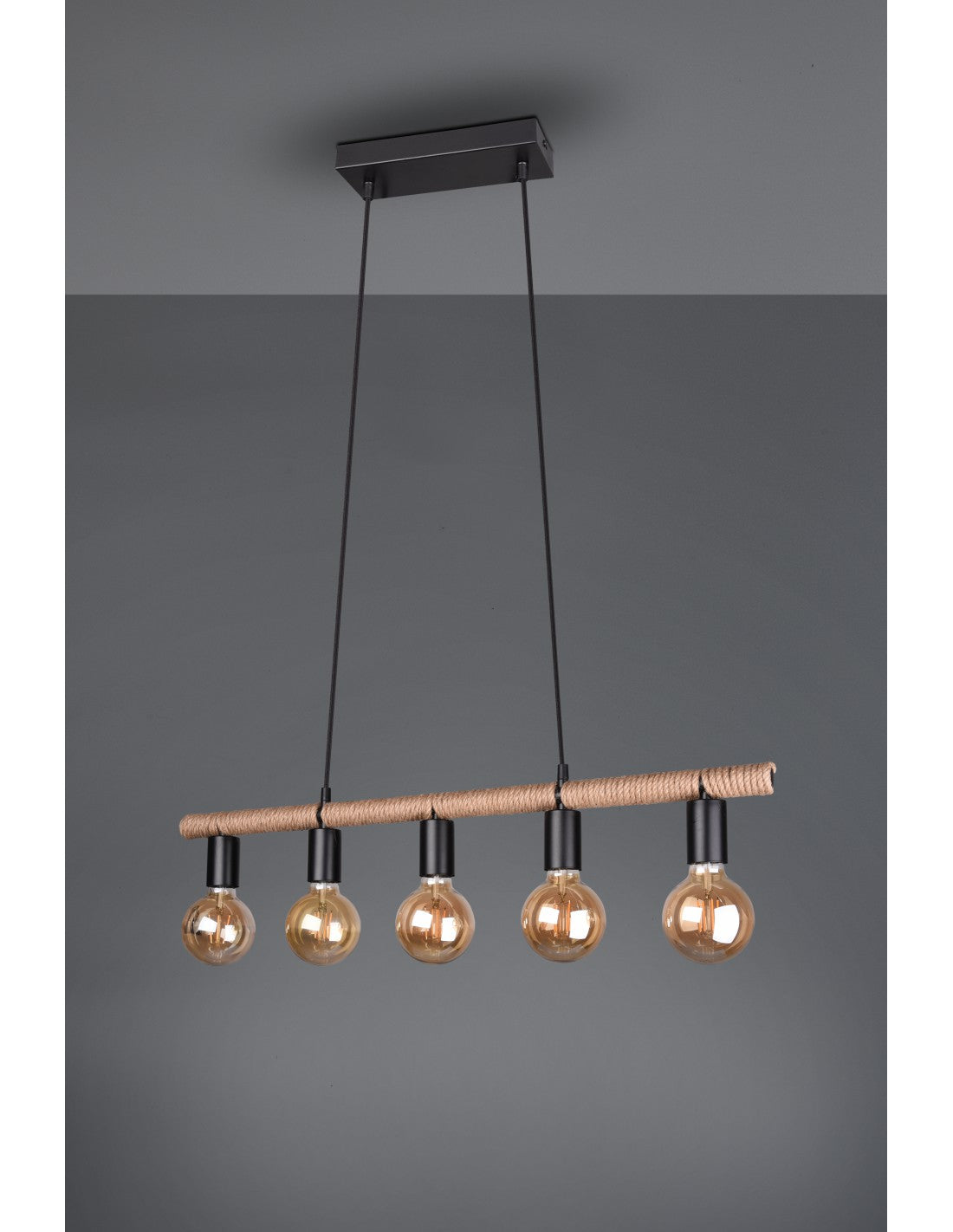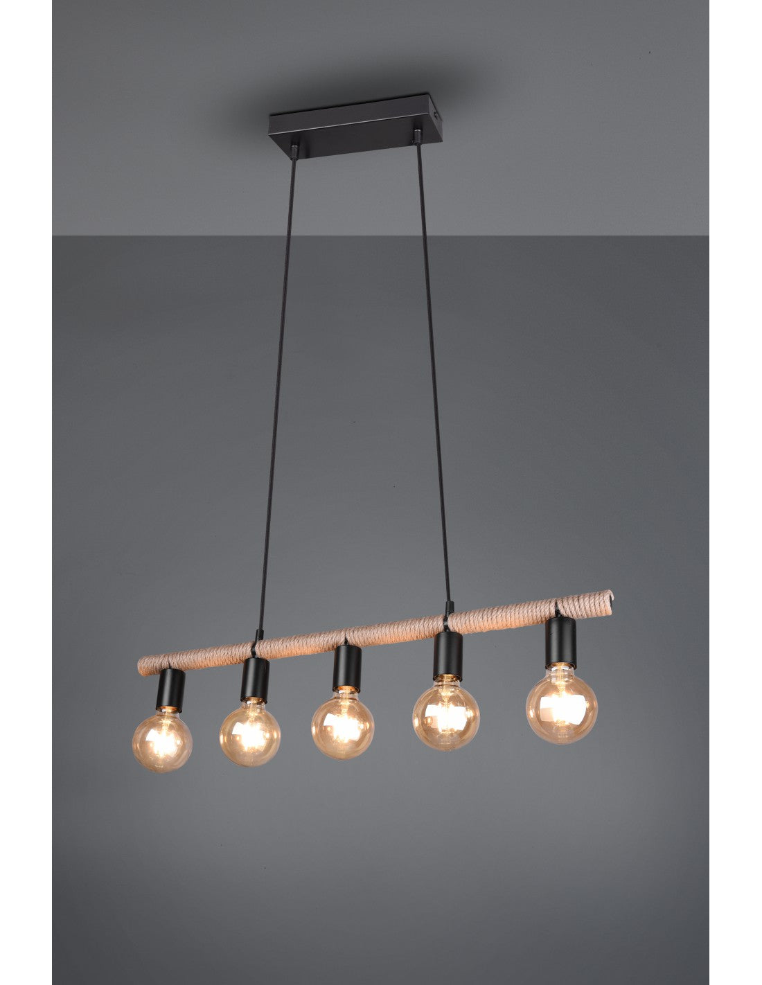 Die Federung EINAR von Trio Lighting Sie verfügt über ein mattschwarzes Metallprofil, einen linearen Stab mit braunem Seil und 5 Lampenfassungen.