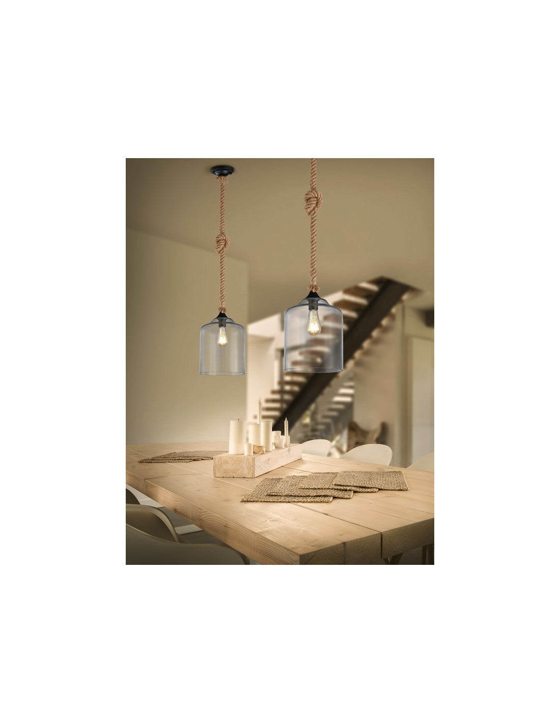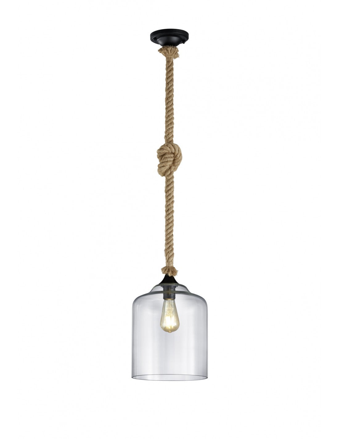 Die PendelleuchteJASPISVonTrio-Beleuchtung Sie besteht aus einer Metallstruktur, die aus einer schwarzen Rosette, einem mit dekorativem Seil umwickelten Stromkabel und einem glasförmigen Diffusor aus klarem, transparentem Glas besteht.