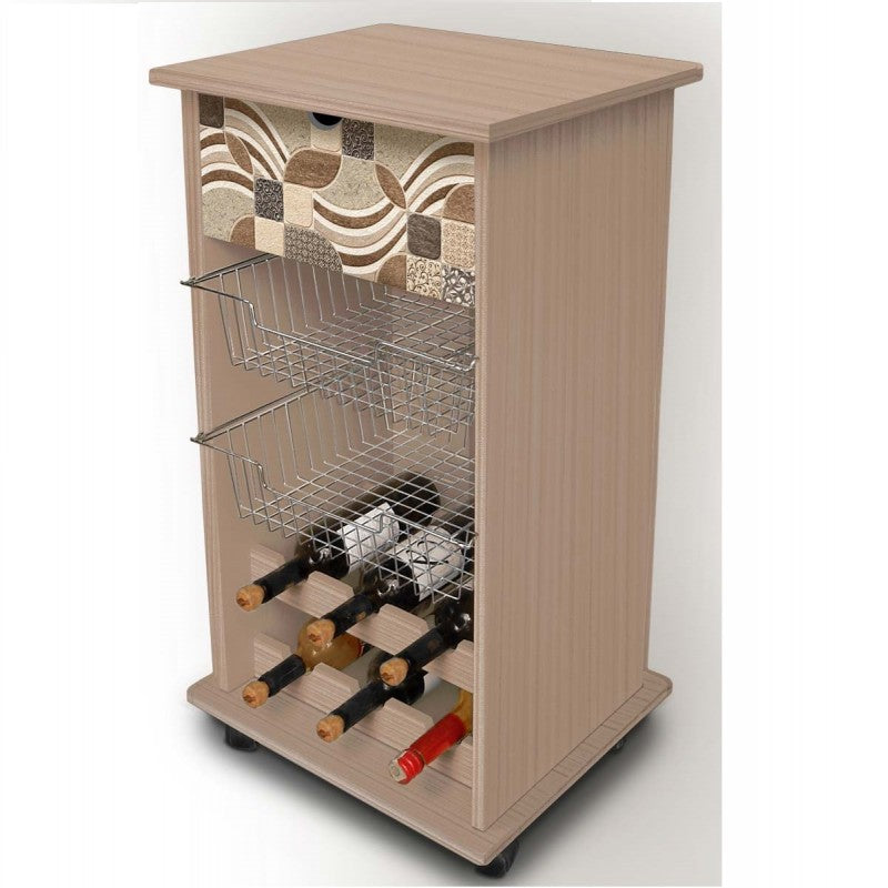 Praktischer Mehrzweck-Küchenwagen aus Holz mit Flaschenhalter, bereits montiert und einsatzbereit, mit oberer Auflagefläche 40x45 cm H 85 cm. Der vordere Teil des Regals misst 45 cm und ist 40 cm tief. Klappbare Schublade, 2 herausnehmbare Stahlkörbe und 2 Flaschenregale mit Schwenkrädern für einfaches Bewegen