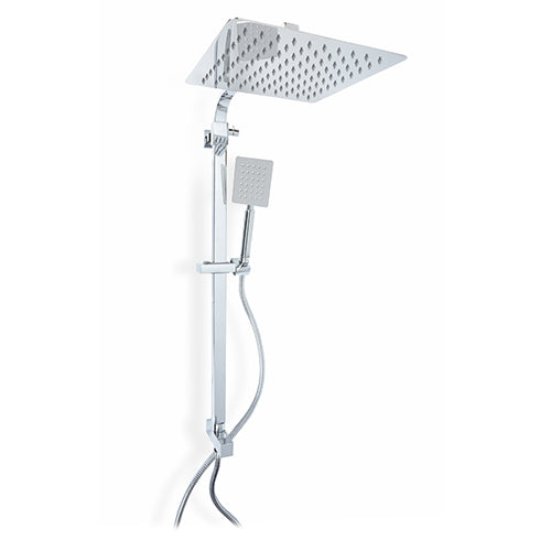 Duschsäule aus Edelstahl AISI 304, Messing und verchromtem Stahl. 25x25 cm großer Duschkopf aus poliertem Edelstahl AISI 304. Handbrause Durchmesser 8x10 cm aus poliertem Edelstahl AISI 304. Teleskopstange mit verstellbaren Aufsätzen. Umsteller mit 1/2 Wasseranschluss.